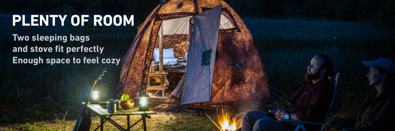 UP2 MINI – is a popular small hot tent by RBM Outdoors. The tent itself is not huge, but roomy enough to fit a company of 3 people. You can take this hot tent and go camping, hiking, fishing or even hunting with your closest friends. Thanks to quick & easy assembly you won’t waste time reading long manuals, while your friends are freezing. You just pop it up, like an umbrella and it is almost done. This tent has two independent layers: Outer - is made of moisture-resistant Oxford 300 PU 4000 fabric. Inner - is made of Oxford 210 fabric with moisture-repellent impregnation of PU 2000 mm. There is air layer between them, which helps to keep warmth inside, and cold outside. Moreover, this model has a stove jack, so you can order and install a wooden stove and create the most comfortable atmosphere inside, while it is freezing and windy outside. Check wood stove Caminus S by RBM Outdoors. The winter tent has removable heat-resistant fabric that can withstand up to 1200 °C (2190 ℉). The chimney stainless steel ring does not allow the hot pipe of the woodstove to touch the structure of the arctic tent, preventing fire accidents. The frame of this artic tent is made of aviation aluminum alloy B95T1 with rod diameter 8mm (0.32”). The dome shape improves aerodynamic features of the tent, making it easier to withstand any winds. Quick installation takes 3 minute.