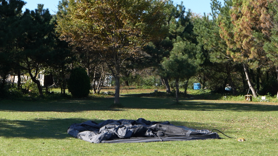 The shelter unfolds flat and rises evenly as air fills the integrated air frame, eliminating poles and manual assembly.