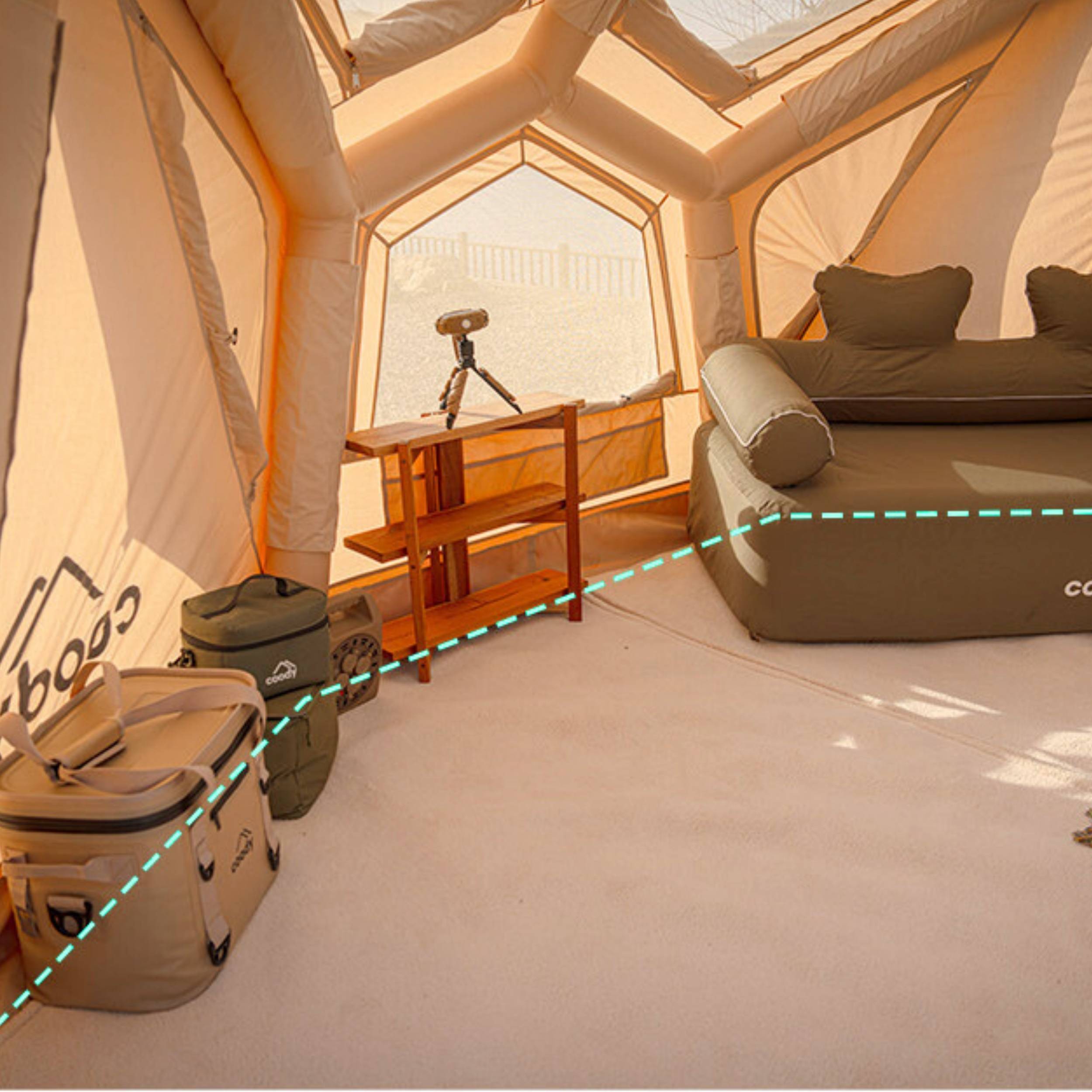The inflatable air-beam structure replaces the need for traditional poles, making setup incredibly simple. Just lay the tent out on a flat surface, secure it in place, attach the pump to the designated valve, and start inflating. Within minutes, the tent will take shape, with the air beams rising evenly to create a stable, rigid structure. No struggling with poles, no need for additional tools — just an easy, stress-free setup experience.
