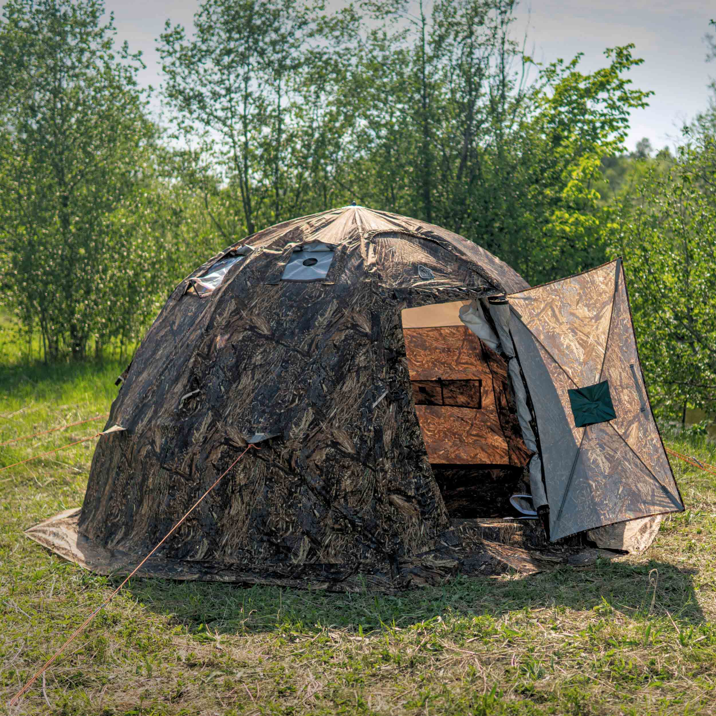 The UP-2 tent can comfortably accommodate 1-4 persons. This medium-sized tent is suitable for all outdoor enthusiasts and will keep your warm regardless of the weather outside. The umbrella-type frame design enables you to set up a tent on any type of terrain in only 2 minutes. This tent is a great choice if you travel by car, but if you want to install it in a more remote area, you’d need an ATV or snowmobile.