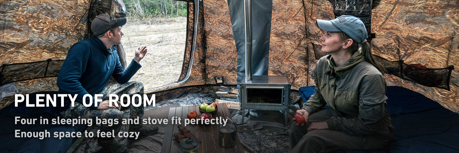 UP5 – is a highly popular hot tent by RBM Outdoors. This bundle includes not only the tent, but also a ready-to-use wood stove and an additional warm floor. The tent itself is roomy and can fit 8 people. No need to take a few tents to spend time in nature. You can take just one UP5 hot tent and go camping, hiking, fishing or even hunting with all your friends, or family with kids. Thanks to quick & easy assembly you won’t waste time reading long manuals, while your friends are freezing. You just pop it up, like an umbrella and it is almost done. This tent has two independent layers: Outer - is made of moisture-resistant Oxford 300 PU 4000 fabric. Inner - is made of Oxford 210 fabric with moisture-repellent impregnation of PU 2000 mm. There is air layer between them, which helps to keep warmth inside, and cold outside. You can unpack and attach additional warm floor, which is very useful in extreme cold conditions, like ice fishing.